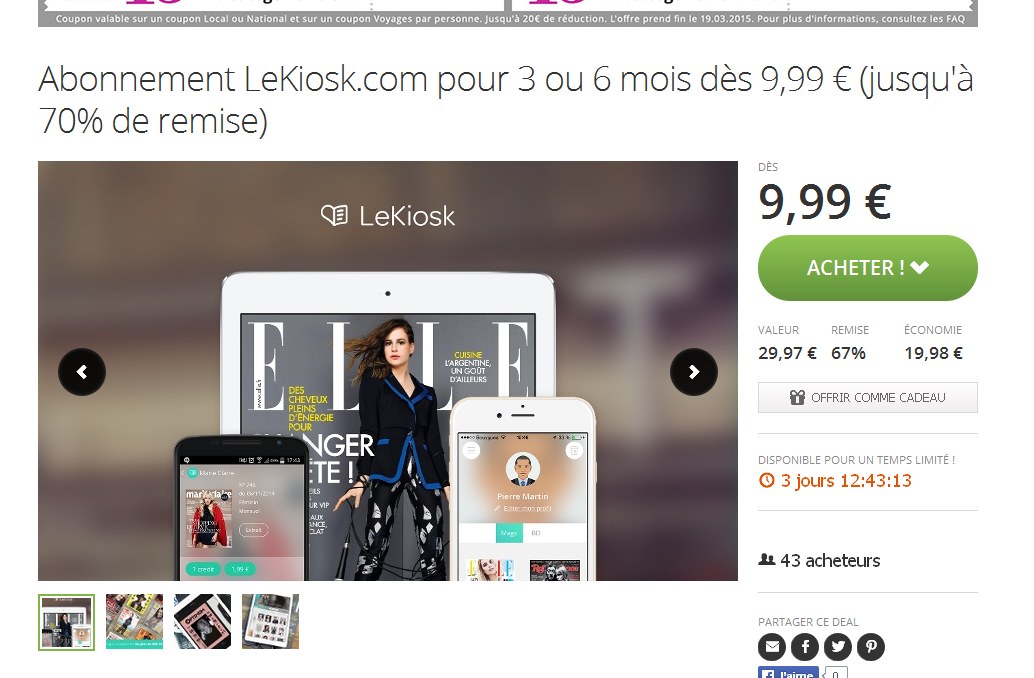Offre qui sans doute interesser du monde : sur groupon on peut pour 9.99 euros avoir un abonnement de 3 mois à la plateforme lekiosk qui permet d’acceder à des magazines numériques en ligne ..