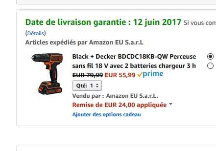 En fait il y a une vente flash sur amazon pour le prime day , concernant la perceuse BCDC18KB-QW à 70 … mais en plus quand on la met dans le panier d’achat si on utilise le code promo « DECKERBEST » le prix tombe à 35€ !!!
