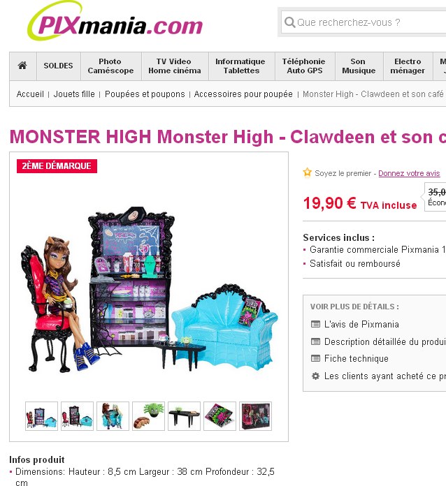 Encore une bonne affaire jouet sur pixmania à destination des filles .. A nouveau une offre concernant des jouets monster high , ces poupées « monstres » pour petites filles .. On peut voir dans les soldes le pack » Clauwdeen et son café post mortem » qui regroupe donc une poupée clawdeen wolf avec differents accessoires : canapé , fauteil , table , meuble ….