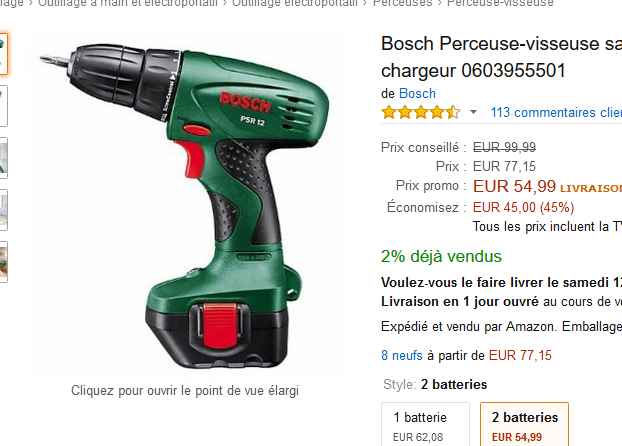 Bon plan pour les bricoleurs du dimanche avec en vente flash le 11 mars sur amazon, un coffret avec une perceuse 12V bosch et deux batteries ..