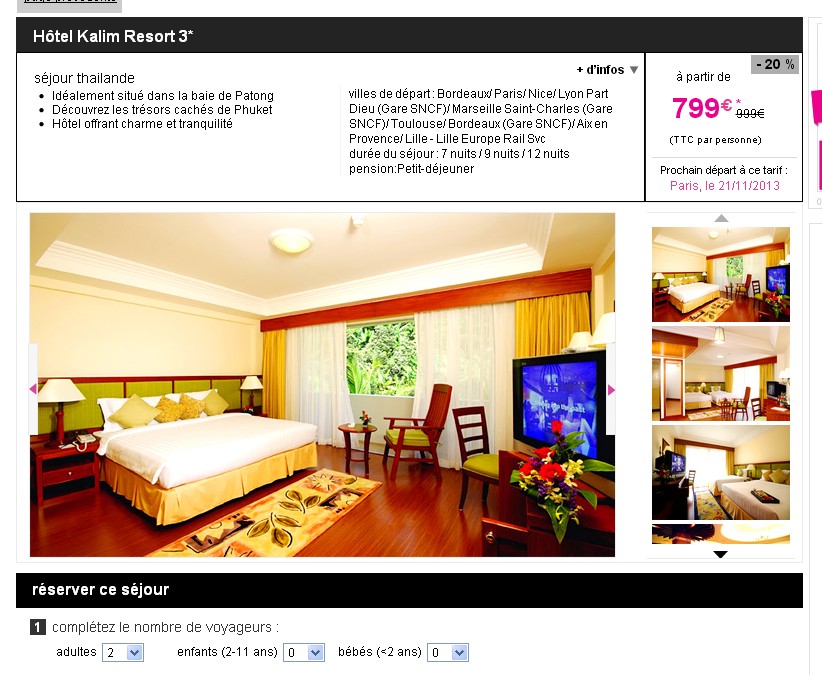 Si vous désirez voir un vrai soleil et une bonne chaleur sous les tropiques, très bon prix sur lastminute pour un séjour de 10 jours / 7 nuits en Thailande à Phuket .. En effet au depart de Paris les 21 novembre et 5 décembre 2013 , le séjour en petit dejeuner dans un hotel 3 étoiles est à 799 euros par personne ..