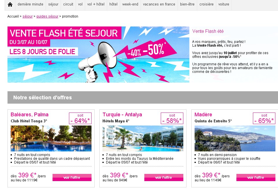 les semaines qui suivent sont plus cheres .. mais la vente flash concerne des departs durant les mois de juillet et d’aout depuis plusieurs villes de France et vers de nombreuses destinations : baleares, canaries, turquie, tunisie, italie, crete, ile Maurice