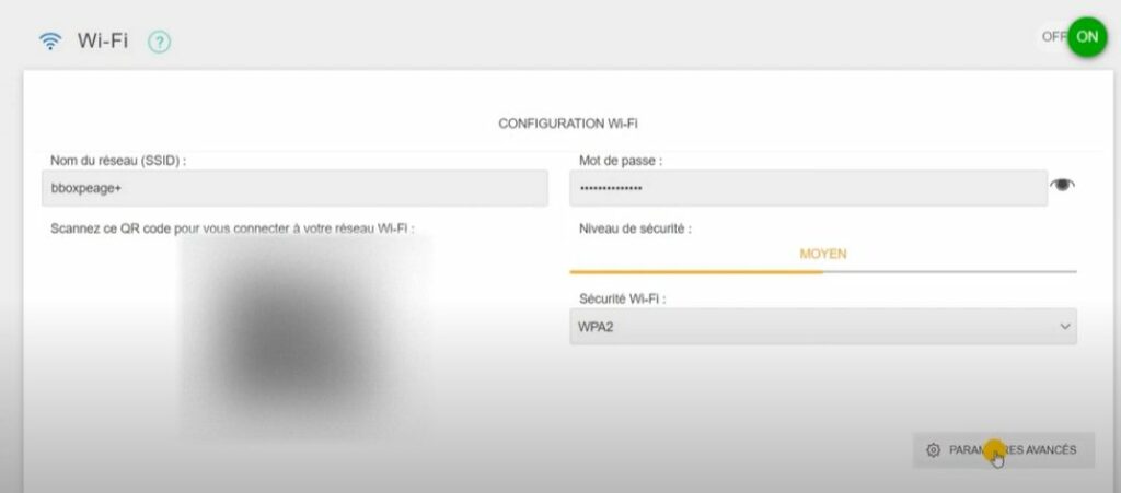 Dans le nouvel écran qui apparait on peut visualiser le nom , le mot de passe, le type de cryptage du réseau actuel mais on va cliquer directement sur « Parametres Avancés »
