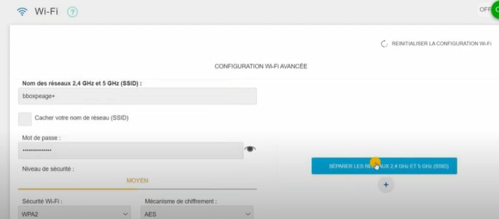 Dans le nouvel écran , on peut voir le bouton « Séparer les réseau wifi 2.4 et 5ghz » sur lequel on va cliquer