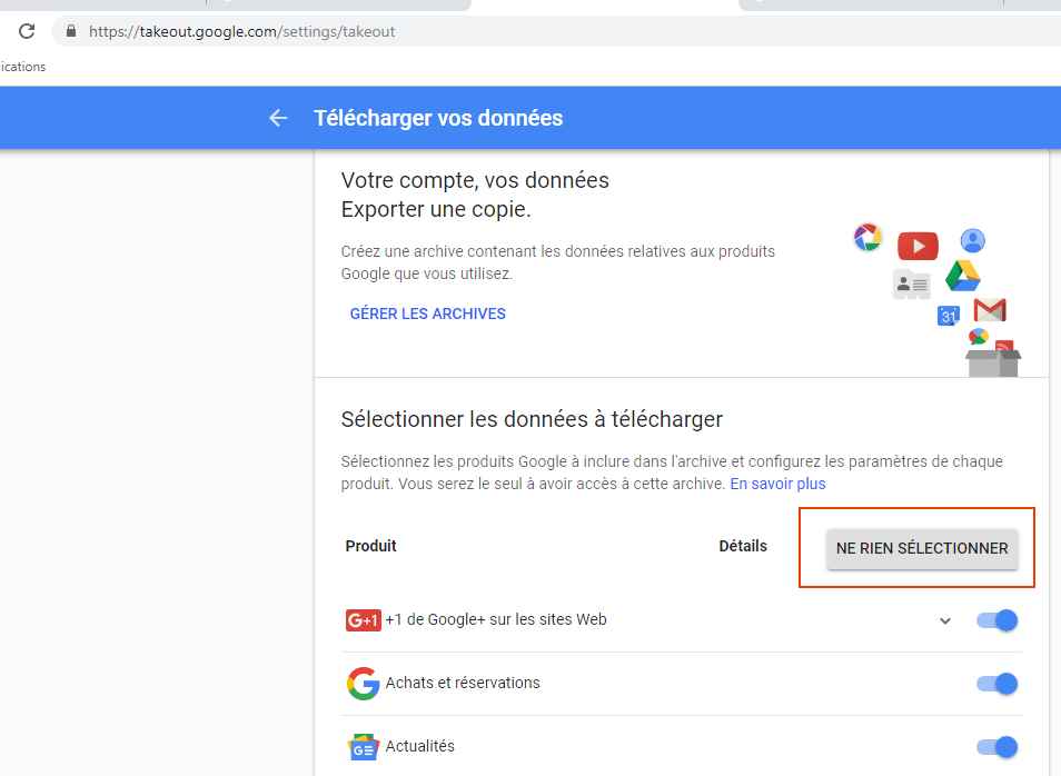 Dans cette écran , par defaut tous les services de google sont préselectionnés, on commencera donc par cliquer sur la case « ne rien sélectionner » pour les décocher tous …