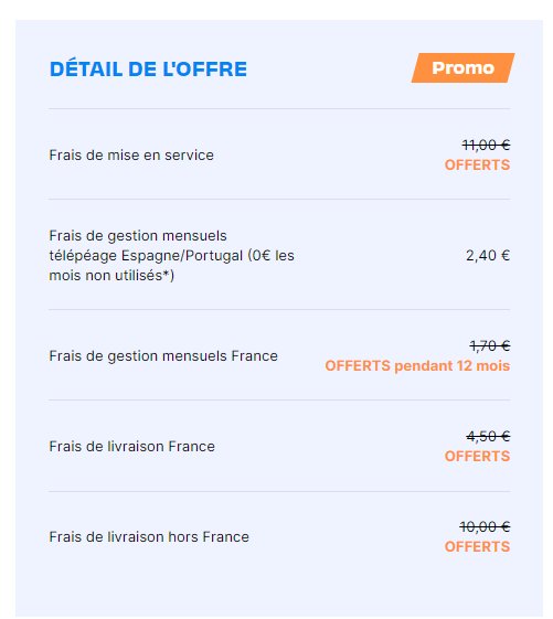 - 2,40€/mois utilisé, si vous circulez sur les réseaux autoroutiers en Espagne et/ou Portugal