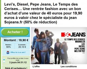 un deal sur groupon qui est peut etre interessant : pour 19.9 euros on peut acheter un bon d’achat d’une valeur de 40 à utiliser sur le site sojeans sur l’achat d’une selection de jeans de differentes marques (levi’s , lee,pepe jeans, wrangler, replays .. ) il y a à priori 592 modeles de jeans concernés par cette offre (cliquez ici pour voir les jeans concernés)..