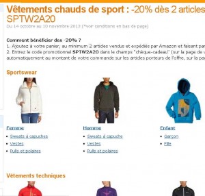 Une offre de saison : sur amazon jusqu’au 10 novembre 2013 , il y a 20% de remise les vetements chauds : à condition d’en acheter au moins 2 ..