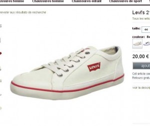 Cliquez ici pour voir ces baskets levi’s sur javari (la plupart des couleurs sont à 20 euros, sauf la deuxieme en partant de la gauche qui est à 40 )