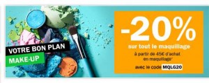 Une offre qui peut etre interessante : sur la parfumerie en ligne douglas-parfumerie , il y a actuellement 20% de remise sur tous les produits et articles de maquillage en saisissant le code promo MQLG20 ..