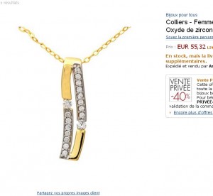 Super affaire sur amazon en bijoux : on peut en effet acheter un collier en or 375/1000 (9 carats donc ) pour 33 euros port inclus .. Collier vendu initialement à 55 euros mais en utilisant le code promo « PRIVEE40 » il y a donc 40% de remise immediate et le prix passe donc à 33.2 euros ..