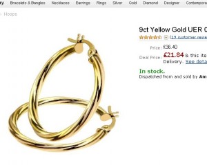 Bon plan cadeau pour noel pour une femme : sur amazon angleterre, en vente éclair on a une paire de boucles d’oreilles en or 9carats (375 /1000 donc ) à 21 pounds .. En ajoutant les frais de livraison pour la France ca fait un prix total à payer en euros de 33 euros seulement ..