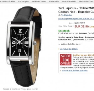 Peut etre une offre interessante pour la fete des mères : sur amazon , le 13/05 il y a en vente eclair une montre femmes Ted Lapidus modele D0464RNIN à 35.96 euros port inclu au lieu de 89 …Montre analogique avec affichage du jour du mois avec un bracelet en cuir … cela parait donc etre une bonne affaire