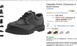 S’il vous faut de nouvelles chaussures pour cet hiver, tres bonne affaire sur amazon concernant une paire de Caterpilar Hommes .. Le modele Fenton .. En effet alors que ce modele se trouve en vente à plus 100 euros un peu partout (sarenza 104.90 , spartoo 105 euros …. ) sur amazon elles ne sont qu’à 63 euros (en promo au lieu de 104 justement) ..