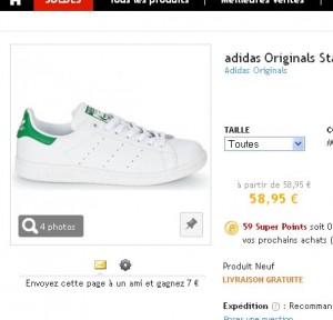 Priceminister nous a transmis l’info , et tout d’abord nous n’avons pas vu que cela était interessant, mais effectivement ces baskets adidas se vendent partout autour de 85 – 90 euros (zalando notamment , et la boutique en ligne adidas ) .. et elles sont soldées nulle part ..