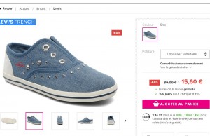Encore un bon prix pour des chaussures : les levi’s french pour filles sont à 15.6 euros port inclus sur le site sarenza .. Des baskets bleu avec le logo levis en rouge sur le coté..