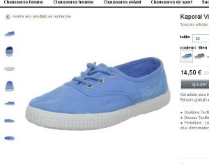Bon plan encore pour des articles kaporal dans les soldes : sur javari on a la paire de baskets Kaporal Victus pour enfants à 14 euros 50 port inclu .. Elles sont soldées à 50% et effectivement sur zalando elles sont à 29 euros .. On peut les trouver moins chères sur spartoo qui les a soldé aussi mais à 23.19 euros la paire ..
