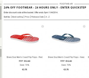 Bonnes affaires chaussures sur le site thehut : le code « QUICKSTEP » donne 24 pourcent de remise sur de nombreuses paires de chaussures .. On peut voir des baskets kappa, puma, new balance … Des tongs , des pantoufles , des balerines pour femmes ..et d’autres chaussures qui passent ainsi à de supers prix ..