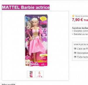 Et encore une bonne affaire jouet : Avec une poupée barbie pas chère à 7.9 euros livraison incluse .. Il s’agit de la poupée « Barbie actrice » que l’on peut voir vendue le double voire le triple ailleurs .. Elle est à pres de 23 euros chez kingjouet notamment ..