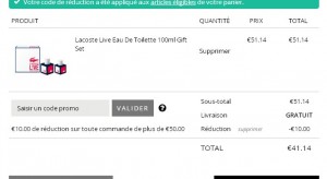 Vendu à 51.14 euros, on peut utiliser le code de reduction « PARFUM50 » qui donne 10 euros de remise immediate .. On paye donc 41.14 tout compris livraison incluse ..
