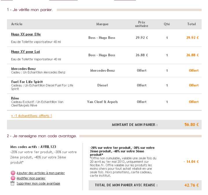 Si vous ne desirez qu’acheter des fragrances soit pour hommes ou soit pour femmes, cela peut etre encore plus interessant .. Car avec deux articles de meme prix (2 flacons xx pour femmes , ou 2 flacons xy pour hommes ) on optimise au mieux le code de reduction