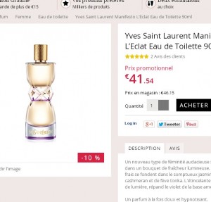 A noter que le code reduction PARFUM50 qui donne 10 euros de remise pour 50 d’achats ne fonctionne pas sur cet article meme si donc on ajoute autre chose afin de depasser les 50 euros … le code de remise de 5% non plus …