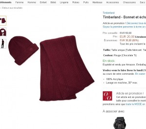 Cela ne parait pas cher pour du timberland : 20 euros au lieu de 50 l’ensemble écharpe + bonnet de la marque américaine ..