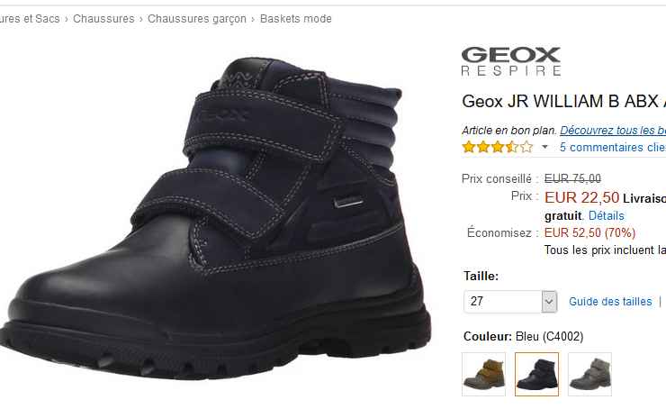 Encore un super prix pour des bottines en cuir pour geox pour garçons : entre 22.5 euros et 24 euros les bottines geox william b abx a de couleur bleues foncées ..