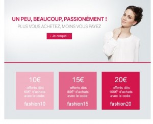 le code fashion10 donne 10 euros de remise pour 60 euros d’achats, le code fashion15 donne 15 euros pour 80 euros d’achats et le code fashion20 qui donne 20 euros de remise pour 100 euros d’achats ..