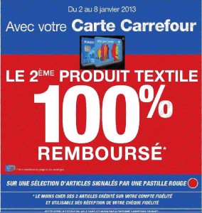 Une offre vetement chez carrefour du 2  au  8 janvier 2013 .. Avec sur une selection d’articles textiles marqué d’un point roule, le deuxieme entierement remboursé sur la carte de fidelité ..