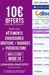 10 euros de réduction pour 50 d’achats sur cdiscount, sur les vétements, chaussures, bagages, puericultures et bijouterie jusqu’au 7 avril ..