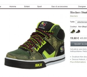 On peut voir une paire de chaussures skechers montantes à 19.6 euros au lieu de 49.. Des chaussures en partie en nubuk ( cuir frotté ) .. Il s’agit du modele « STUNTZ » ..