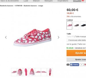Encore du stock sur zalando et des offres interessantes en chaussures .. On peut voir pour les femmes fans de kawai et d’hello kitty , des baskets Vans rose à l’effigie du petit chat japonais ..