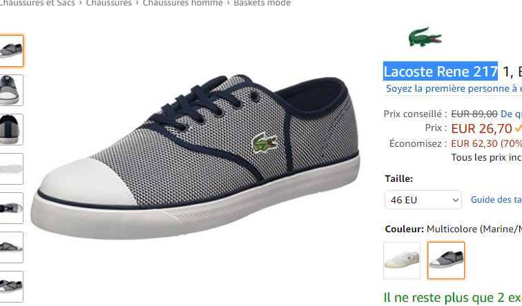 Une paire de chaussures lacoste pas chère encore une fois sur amazon : 26.7€ les Rene 217 …