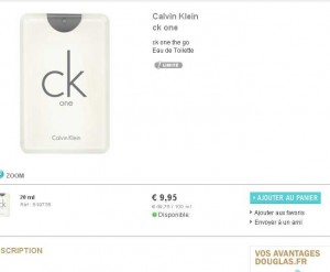 Et on poursuit avec les bons plans parfums sur douglas parfumerie : Le petit vaporisateur 20ml d’eau de toilette CK one de Calvin Klein .. la version « On the Go » de voyage est à moins de 10 euros .. 9.95 euros précisement ..