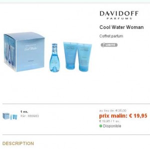 Retour sur douglas parfumerie ce jour (19/12 ), d’un coffret de marque à moins de 20 euros .. Il s’agit d’un coffret d’eau de toilette Cool Water Woman de la marque Davidoff proposé à 19.95 euros ..