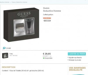 Encore une bonne affaire eau de toilette sur douglas parfumerie :  la nouvelle fragrance pour hommes Seductive de Guess , se vend normalement autour de 40euros en vapo 30ml (41.20 sur nocibe par exemple hors frais de port ) … Mais sur douglas pour moins de 30 euros on peut avoir un coffret contenant non seulement l’eau de toilette mais aussi un gel douche 200 ml ..