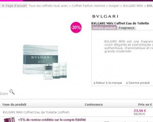 Dans les soldes parfum sur marionnaud , il reste un coffret pour hommes disponible à un super prix : c’est le coffret de l’eau de toilette Bulgari Man qui est vendue à 23.56 euros seulement ..