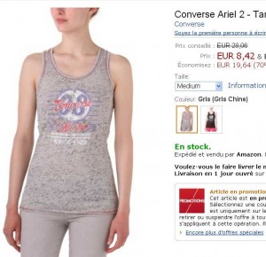 Si vous aimez la marque converse, et qu’outre les baskets il vous faut des vétements de la marque, petit prix pour des débardeurs de la marque américaine sur amazon .. 8.42 euros port inclu le debardeur pour femmes ..
