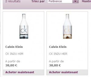 En effet on y trouve les vaporisateurs 50ml des fragrances CK IN2U HIM et HER à 25.45 euros port inclu ..