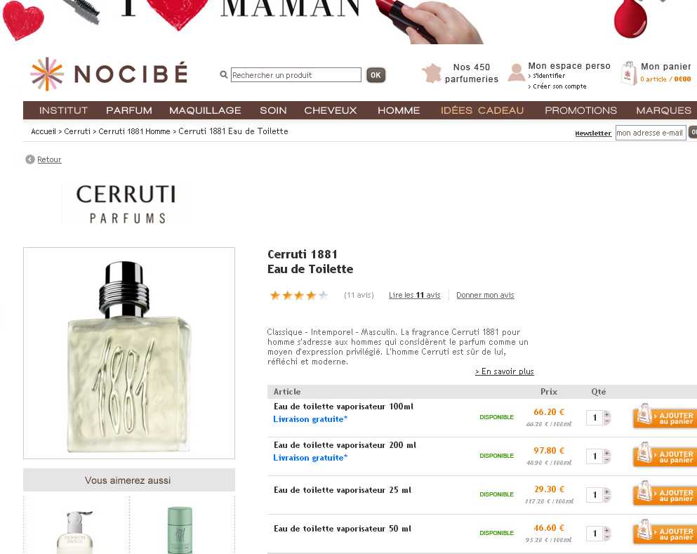 Encore une bonne affaire eau de toilette sur douglas parfumerie :  Alors que l’eau de toilette Cerruti 1881 pour hommes se vend pas loin de 30 euros en 25 ml (29.30 sur nocibe) ,  Sur douglas parfumerie , il est à 15.20 euros ..