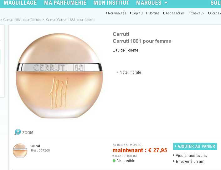 Bonne affaire parfum pour femmes : sur le site anglais thehut qui livre gratuitement en France, on a l’eau de toilette Cerruti 1881 pour femmes donc à 19.65 euros port inclu ..