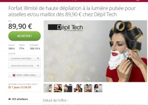 Bon plan pour des forfaits épilations à lumiere pulsée dans 30 centres Depil Tech de France … Sur groupon on peut acheter des bons pour des forfaits ilimités à 89 euros (pour soit maillot , soit aisselles) , soit à 139 euros pour les deux zones ..