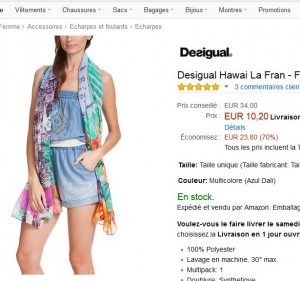 Par exemple , le grand foulard desigual hawai la fran à 10.2 euros … Foulard très coloré , et très grand .. avec 3 avis ultra positifs des acheteuses …