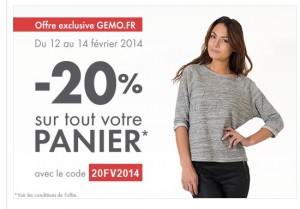 Bonne affaire sur le site gemo pour les derniers jours des soldes .. Du 12 au 14 fevrier on peut utiliser le code de réduction « 20FV2014 » .. Ce coupon donne 20% de remise sur l’ensemble du site et meme sur les articles en soldes ..