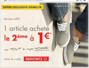 Une nouvelle offre qui peut être interessante sur le site gemo : les 12 et 13 juin , pour deux articles du rayon homme acheté , le deuxieme est facturé seulement 1 euro ..