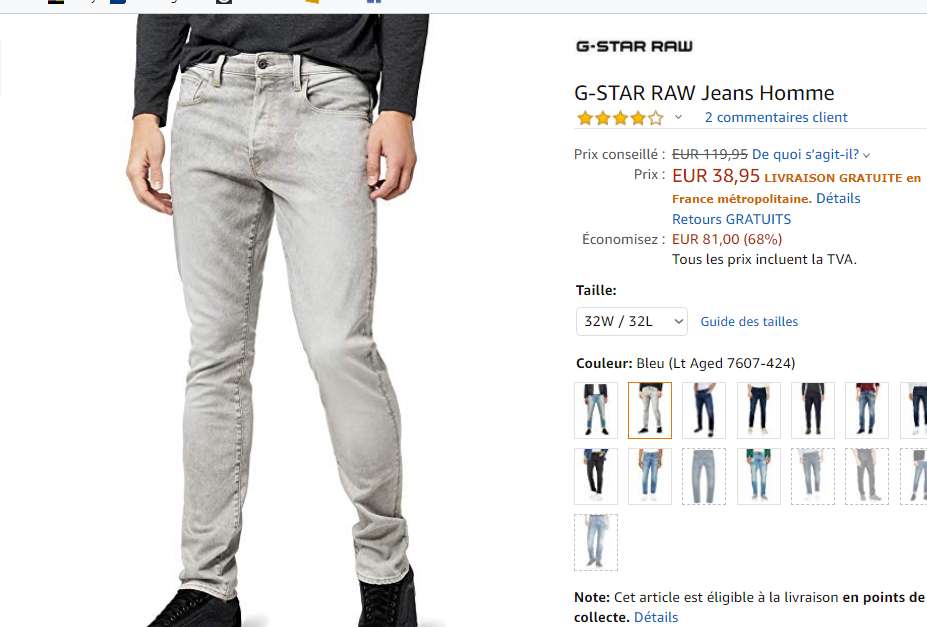 Comme par exemple sur Amazon, avec le Jeans GSTAR 3301 de couleur grise vendu entre entre 35 – 38€ dans de nombreuses tailles …