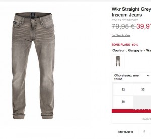 Un jeans gris disponible dans les tailles 32 33 34 36 38 .. Pour la longueur c’est forcement 34 …