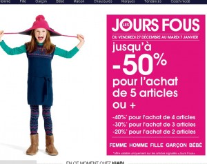Si vous aimez les vetements vendus dans l’enseigne kiabi, une offre « les jours fous » peut vous interesser : sur la boutique en ligne actuellement, il y a un certains nombre d’articles qui font l’objet d’une promo avec une remise qui evolue en fonction du nombre d’articles achetés : 20% pour deux articles, 30 pour 3 , 40 pour 4 et 50% pour 5 articles ..