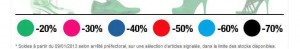 A noter que sur le site on visualise les paires qui seront soldées avec leur prix de base , une pastille de couleur sur la fiche article indique le taux de remise qu’il y aura (ainsi une pastille noire indique 70% de remise ) ..